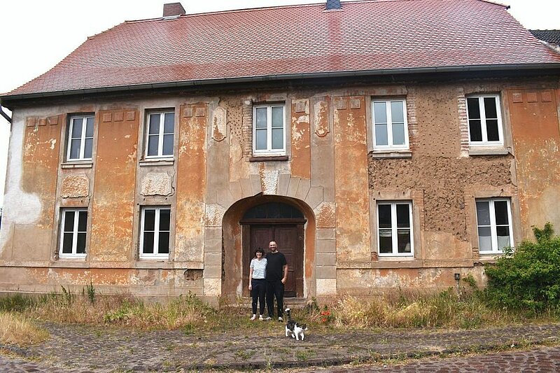 Wahrlich herrschaftlich erhebt sich das alte Gutshaus im Petersberger Ortsteil Kaltenmark im Saalekreis aus Richtung Halle kommend mit seiner 5-achsigen Front im Zentrum des Ortes. Bis vor wenigen Jahren war das unter Denkmalschutz stehende Wohnhaus noch ein Ärgernis im Ort – seit den 2000er Jahren stand es leer, die marode Bausubstanz war nur notdürftig mit einem Bauzaun gesichert. Bis Vera und Jacob das Haus im Jahr 2016 für einen symbolischen Preis übernahmen und seitdem behutsam, denkmal- und materialgerecht in Eigenleistung sanieren.