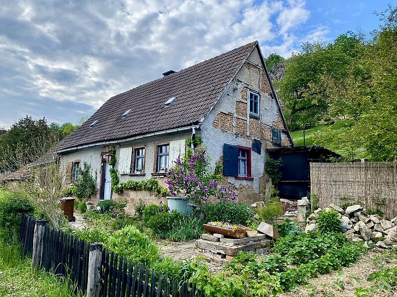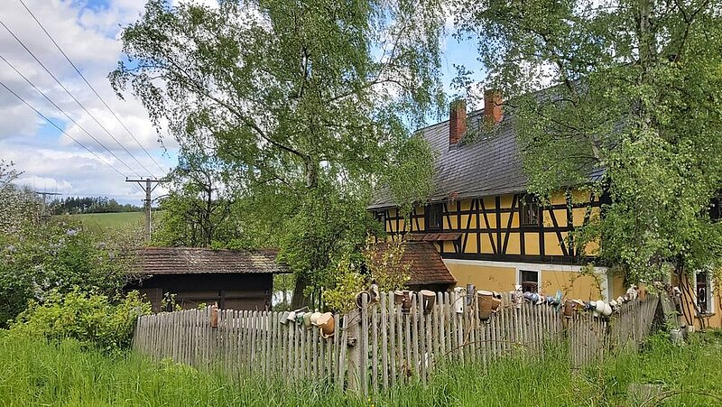Heute öffnet Karin uns die Tür zu ihrem Haus, einem versteckten Kleinod in der ostthüringischen Ortschaft Kleinreinsdorf. Schon bevor man ins Haus eintritt, erkennt man, mit wie viel Liebe zum Detail am Gebäude gearbeitet wurde. Lehmputz an der Fassade und in den Gefachen verrät bereits etwas über das Innere des Hauses. Zum Haus selbst, ist leider keine genaue Datierung vorhanden, aber Karin vermutet, dass es noch vor 1850 errichtet wurde. Ihr verstorbener Ehemann Karl erbte das Häuschen um 1990 von seiner Cousine. 1996 zog Karin mit hinzu. Viel über das Haus und seine Geschichte ist nicht mehr bekannt. Ringe zum Anpflocken von Ziegen und Ablaufrinnen im Boden weisen darauf hin, dass es einst wohl einem Ziegenbauern als Haus diente.