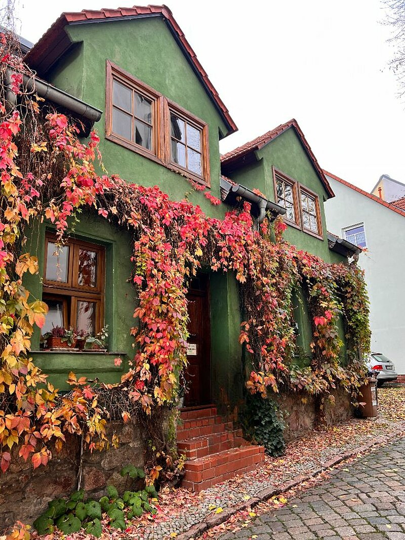 Die grüne Fassade wird durch wilde Weinranken geschmückt, die sich im Herbst in ein warmes Rot verwandeln. Hölzerne Fenster lassen Licht in das kleine Häuschen, das vom Erdgeschoss bis unter die Decke mit Kunst gefüllt ist. Diese Kreativität trägt Jeannette auch nach außen und bietet z.B. regelmäßige Schreibwerkstätten oder Angewandtes Figurenspiel auf ihrer Website an: https://www.stoerfelle.de/ressourcen