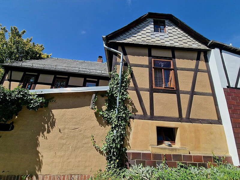 Vor 26 Jahren erwarb das kreative Paar Jeannette und Ulrich das Zwerchhaus und sanierte es mit viel Liebe zu den ursprünglichen Materialien. Das Erdgeschoss besteht aus Wellerlehm und ruht auf einem Bruchsteinsockel. Fehlstellen wurden im Laufe der Jahre fachgerecht saniert. Auf dem Erdgeschoss sitzt ein geschlossener bzw. verdeckter Fachwerkaufbau. Der Dachstuhl und der Fachwerkaufsatz mussten vor 25 Jahren komplett erneuert werden: Der Dachfirst wurde leicht angehoben und die Gauben wurden dezent erweitert ohne die ursprüngliche Kubatur zu verändern.