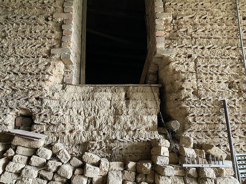 2019 zog die Familie zunächst provisorisch in das Gästehaus, während das Haupthaus noch ausgebaut wurde. Bereits im ersten Sommer fiel ihnen auf, wie angenehm kühl das Erdgeschoss blieb – ein Effekt, der typisch für massive Lehmmauern ist. Erst später wurde ihnen bewusst, dass sowohl das Gäste- als auch das Wohnhaus im Erdgeschoss tragend aus Lehm errichtet worden waren. Die dicken Wände und tiefen Fensterlaibungen gaben erste Hinweise. Bei kleineren Sanierungen zeigte sich immer wieder das typische Lehm-Stroh-Gemisch, das Gewissheit brachte. Die oberen Geschosse wurden vermutlich in den 1930er-Jahren mehrreihig aus Backsteinen ergänzt.