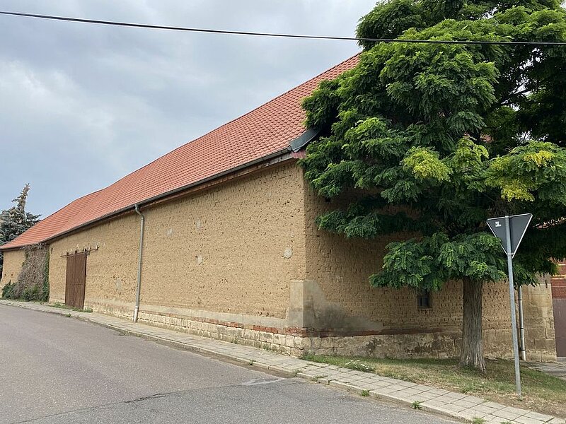 Der vordere Teil dieser großen Scheune in Klosterhäseler ist ein Beispiel dafür, dass auch großformatig mit Lehmsteinen gebaut wurde. Der hintere Teil wurde dagegen ganz traditionell in Wellerlehmbauweise errichtet - die Trennung beider Techniken lässt sich an der veränderten Wandstruktur im Bereich des Fallrohrs der Dachrinne gut erkennen. Die Scheune ist Teil eines großen Dreiseithofes, dessen Gründung vermutlich in das 19. Jahrhundert gelegt werden kann. Da die Wirtschaftsgebäude in der Regel unverputzt blieben, ist die mitteldeutsche Massivlehmtradition an ihnen besonders gut erkennbar und belegt gleichzeitig die hohe Stabilität und Dauerhaftigkeit von Lehmhäusern.