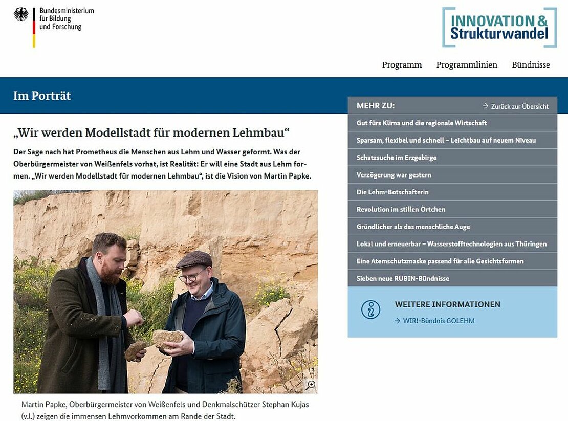 Mit der Unterzeichnung einer Absichtserklärung hat sich die Stadt Weißenfels im Oktober 2022 dem GOLEHM-Bündnis angeschlossen und ist damit der nunmehr 22. Bündnispartner des GOLEHM-Netzwerkes. Unter dem amtierenden Oberbürgermeister Martin Papke soll Weißenfels mit Unterstützung der GOLEHM-Initiative zur Projektstadt für moderne Lehmhäuser entwickelt werden. In der vom Strukturwandel geprägten Stadt bietet der reiche Bestand an historischer und denkmalgeschützter Bausubstanz ein großes Potential für innovative Anwendungen zum ressourcenschonenden und klimaneutralen Bauen mit Lehm.