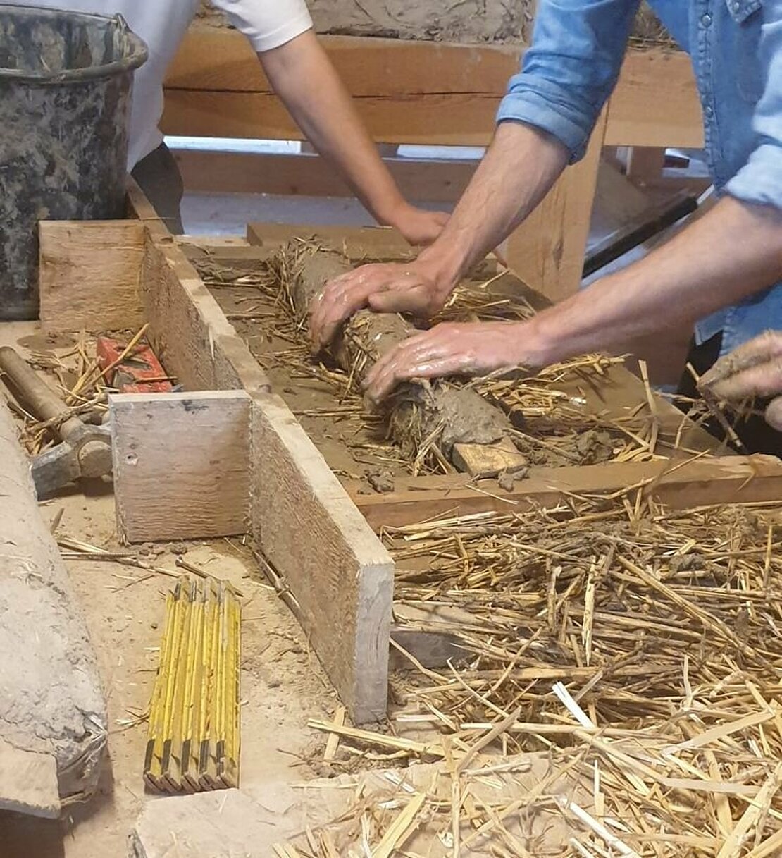 Die Workshops finden in der historischen Tenne der Schwemme unter künstlerischer Anleitung von Mariella Gänsewig statt und werden als Teil des Projektes LEHM-BAU-KULTUR im Rahmen des Neuen Europäischen Bauhauses durch die EU gefördert.